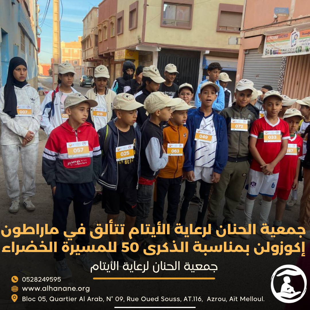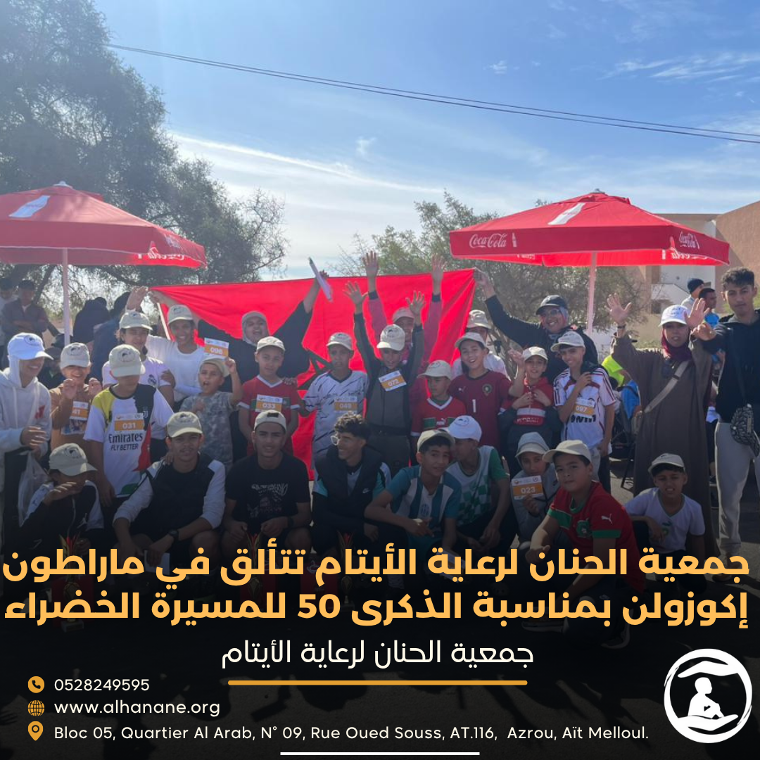 في إطار الاحتفالات بالذكرى الخمسين للمسيرة الخضراء، شاركت جمعية الحنان لرعاية الأيتام في الماراطون الذي نظمته جمعية إكوزولن يوم الأحد 2 نونبر 2025، بالقرب من منتزه تمرسيط. وقد شهد هذا الحدث الرياضي مشاركة 27 طفلاً من الأيتام من مختلف الأعمار، ليبرهنوا على عزيمتهم وإصرارهم في تحقيق التميز والنجاح.